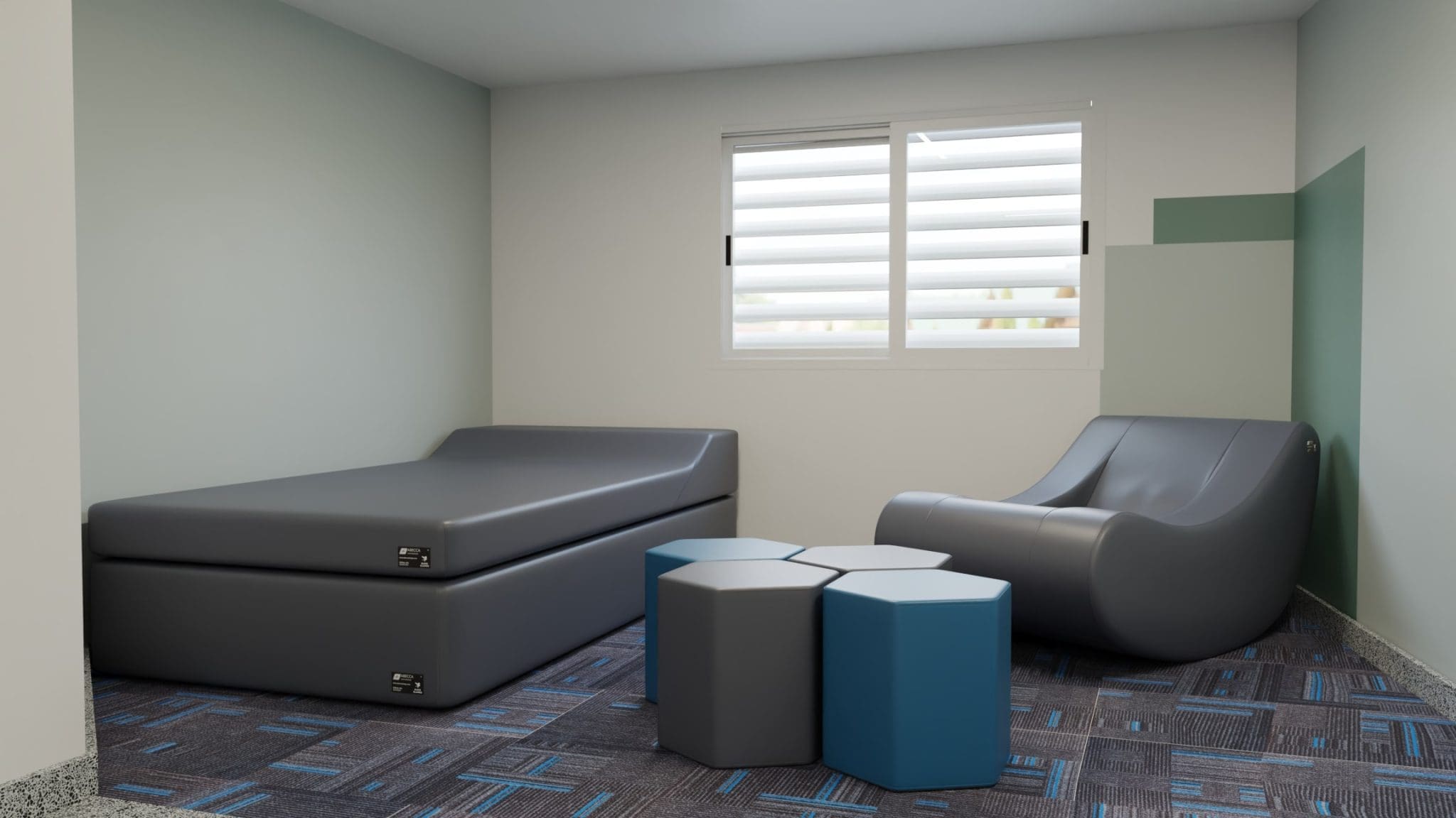 Foam-based construction provides a soft yet supportive feel, enhancing comfort while also being structurally resilient. Our furniture is versatile for various spaces, from holding cells to therapy rooms, adapting to meet the needs of each setting.